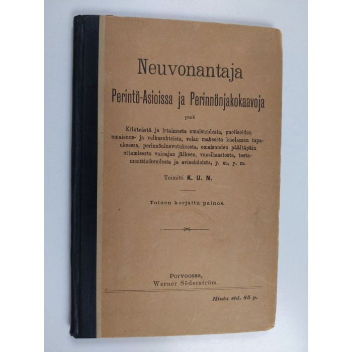 | Teoksen nimi | Neuvonantaja perintö-asioissa ja perintöjakokaavoja ynnä kiinteästä ja irtaimesta omaisuudesta, puolisoiden omaisuus- ja velkasuhteista, velan maksosta kuoleman tapauksessa, perinnönluovutuksesta, omaisuuden päältäpäin ottamisesta vainajan jälkeen, vuosih |
