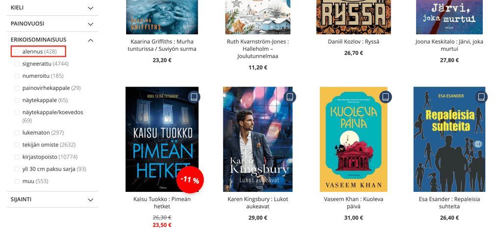 Haluatko nähdä vain alennetut kirjat valikoimassamme? Klikkaa itsesi kirjakategoriaan, ja etsi sitten vasemman reunan suodattimista kohta Erikoisominaisuudet → Alennus, niin näet kaikki alehintaiset kirjat yhdellä silmäyksellä. Mobiililaitteella klikkaa vasemmalla pientä laatikkoa "Rajaa" ja etsi Erikoisominaisuus → Alennus.